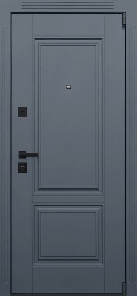 Порошковое покрытие "муар серый". Панель МДФ 16 мм. Объемная фрезеровка. Цвет "графит". Наличник МДФ: толщина 16 мм, ширина 85 мм.