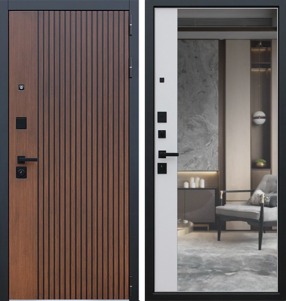 Порошковое покрытие "Муар черный". Экошпонированная дизайнерская панель МДФ 10 мм. Линейная фрезеровка. Цветовая комбинация: "дуб кантри темный", черное патинирование по фрезеровке. Наличник МДФ гладкий 80 мм., цвет "черный кварц".